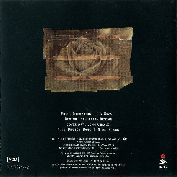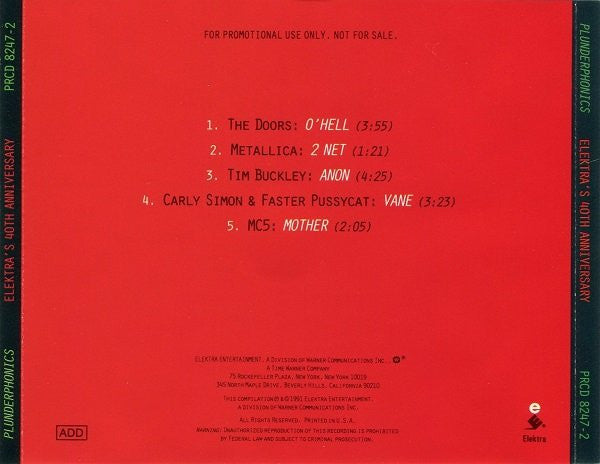 Spine: Elektra's 40th Anniversary Back cover: For promotional use only. Not for sale. Elektra Entertainment, a division of Warner Communications Inc. [[l33057 logo A Time Warner Company This compilation ℗ & © 1991 Elektra Entertainment, a division of Warner Communications Inc. Printed in U.S.A. CD face: For promotional use only. Not for sale. A Warner Communications Company [[l33057 logo This compilation ℗ 1991 Elektra Entertainment, a division of Warner Communications Inc. Made in U.S.A. Inner panels: Elektra Entertainment, a division of Warner Communications Inc., [[l33057 logo A Time Warner Company This compilation ℗ & © 1991 Elektra Entertainment, a division of Warner Communications Inc. Printed in U.S.A. - Track 1 Sources: Hello I Love You and the additional hits: 704527, 221206,Touch Me, 1096518,The End, 398533, 1709936, 264856, Five To One, 45432, 1462705, [r=5965088, 45326 From 1868 (Elektra #60345) and [a28972 "Hello I Love You" from Rubaiyat: Elektra's 40th Anniversary (Elektra #60940) - Track 2 Sources: "Net" from 341431 (1989, out of print). "Net" is a survey of portions of tracks from the Metallica And Justice For All (Elektra #60812), and the Metallica version of "Stone Cold Crazy" from Rubaiyat: Elektra's 40th Anniversary (Elektra #60940) - Track 3 Source: "Anonymous Proposition" from Tim Buckley 72160 (Elektra #74074) - Track 4 Sources: "You're So Vain" from Carly Simon 99919 (Elektra #75049) and Faster Pussycat "You're So Vain" from Rubaiyat: Elektra's 40th Anniversary (Elektra #60940) - Track 5 Source: various tracks from MC5 64011 (Elektra #74042) - All sources have been faithfully transferred from commercially available compact discs and phonograph records, or from digital dubs of the stereo master tapes. No use has been made of multitrack source tapes, studio outtakes, or of any material that isn't or hasn't been made commercially available. - Thanks: [a7716862, [a257402, [a949270, [a227730, [a1202992, [a257414, [a7193899, Valerie Vickers, Elektra Entertainment. Also, [a1150387, [a940710, [a99731, Mendelson Joe and [a448498. - Rejektrix: Additional tracks were planned for potential inclusion in this package. Listeners may wish to try some of these recipes in the privacy of their own home entertainment systems: 1. A minute long abridgement, reduced to minimal redundancy, of Paul Butterfield's Born In Chicago slowed down from the equivalent of 45 RPM to 33⅓ RPM (an option no longer readily available to listeners in this age of CD's) resulting in a blacker sound of a more leisurely tempo; while at the same time the sense of the song rushes by. 2. Two mixes, both combining the [a254494 and the Kronos String Quartet versions of 6202, one of which sounds like Television with strings, while the other is more along the lines of Kronos with rock band. 3. Field recordings of [a93841 singing I'd Like To Teach The World To Sing in various locales and situations including over the public address system at a [l1810547 game and for the mostly Japanese passersby at the Osaka World's Fair; on a blaster in an aviary and in a canyon; a passing version through a 600 watt automotive system. 4. A melismatic and choralzied tracking of [a90233 singing 47822 using the stylistic models of [a70829' 78274 ([a189718 & [a259398) and [a465983's 167099. 5. Elimination of the snare drum from a few verses of [a200567's These Days in preparation for grafting with the [a63486 cover. This sort of simulations of a remix, in this case achieved by the precise editing of the beat, could be more easily effected if songs were released in multitrack, interactive versions. A 4, 6 or 8 track mix-programmable K7 or CD player would opportune multiple choices, for instance vocal-eliminated instrumental versions, extending the preferences a listener can apply using traditional balance and tone controls. 6. Suggested duets inspired by Rubaiyat: Elektra's 40th Anniversary: [a41105 & [a303471 [a218691 & [a143225 The two very similar versions of Seven & Seven Is by [a83242 & [a48410 [a99731 and [a39770 115842 between The Womacks & [a171427 Play them anyway you like!