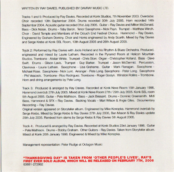 ©2005 V2 Music Limited except Track 2 ℗2002 Warner Music UK Ltd. © 2005 V2 Music Limited. Manufactured and Distributed in the USA by Sony BMG Music Entertainment. Tracks 1 and 5: Recorded at Konk Studios, 7th November 2003. Overdubs: Choir recorded 13th September 2004. Drums recorded 30th July 2005. Horn Recorded 14th September 2004. Acoustic guitar recorded 31st July 2005. Mixed at Konk SSL Room, 13th August 2005 and 26th August 2005. Track 3: Recorded at Konk Neve Room 15th January 1998, Hammond overdub 27th July 2005. Mixed at Konk Neve Room 27th/29th July 2005. Konk SSL room 5th August 2005. Original version appeared on Storyteller album. Mixed 27th July 2005, update 29th July 2005. Remixed froms stems 5th August 2005. Track 4: Recorded at Konk Studios 23rd January 1998. Mixed at Konk 26th January 1998. "Thanksgiving Day" is taken from 'Other People's Lives', Ray's first ever solo album, which will be released on February 7th, 2006.
