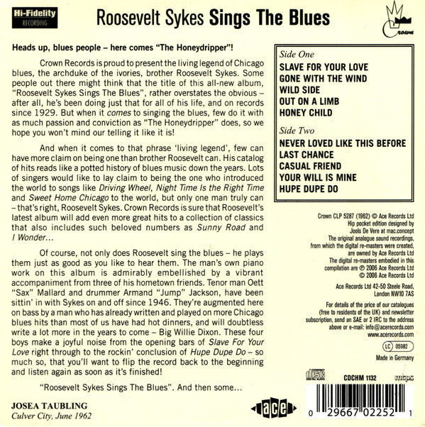 Recorded in Chicago, April or May 1962. Performed by Roosevelt Sykes (voc, p) with Oett "Sax" Mallard (ts); Lee Jackson (eg); "Big" Willie Dixon (b); Armand "Jump" Jackson (d) [not mentioned in liner notes. Made in Germany. Reissue released in Cardboard Sleeve (Mini LP Replica).