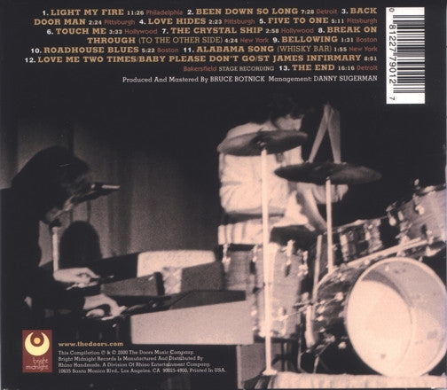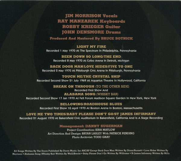 Limited edition CD only available from The Doors website. 1) Recorded May 1 1970 at the Spectrum in Philadelphia, Pennsylvania 2,13) Recorded May 8, 1970 at Cobo Arena in Detroit, Michigan 3-5) Recorded May 2 1970 at Pittsburgh Civic Arena in Pittsburgh, Pennsylvania 6-7) Recorded Second Show July 21 1969 at Aquarius Theatre in Hollywood, California 8) Recorded First Show January 17, 1970 at Felt Forum Madison Square Garden in New York 9-10) Recorded First Show April 10 1970 at Boston Arena in Boston, Massachusetts 11) Recorded Second Show January 17, 1970 at Felt Forum Madison Square Garden in New York 12) Recorded August 21 1970 at Bakersfield Civic Auditorium in Bakersfield, California and is a stage recording.