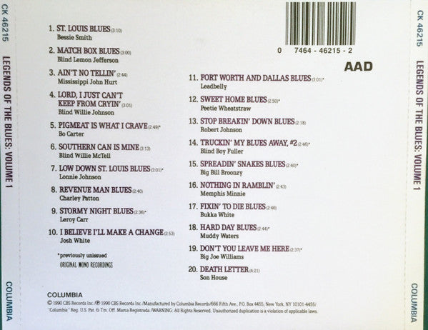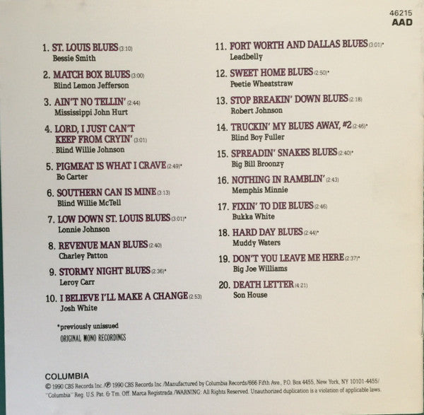 Track 1 Recorded New York City. Feb 14, 1925. Track 2 Recorded Atlanta, GA. Mar 14,1927. Track 3 Recorded New York City. Dec 21, 1928. Track 4 Recorded Dallas, TX. Dec. 5, 1928. Track 5 Recorded New York City. Jun. 5, 1931. Track 6 Recorded Atlanta, GA. Oct. 23, 1931. Track 7 Recorded New York City. Feb. 11,1931. Track 8 Recorded New York City. Jan. 31, 1934. Track 9 Recorded New York City. Aug. 14, 1934. Track 10 Recorded New York City. Aug. 1, 1934. Track 11 Recorded New York city. Jan. 24, 1935. Track 12 Recorded Chicago. Feb. 13, 1936. Track 13 Recorded Dallas, TX. June 20, 1937 Track 14 Recorded New York City. Feb. 9, 1937, Track 15 Recorded Chicago. Feb. 5, 1939. Track 16 Recorded Chicago. June 27,1940 Track 17 Recorded Chicago. Mar. 8, 1940 Track 18 Recorded Chicago. Sept. 27 1946. Track 19 Recorded Chicago. Dec. 18, 1947. Track 20 Recorded New York. Apr. 12, 1965. ℗ 1990 CBS Records Inc.